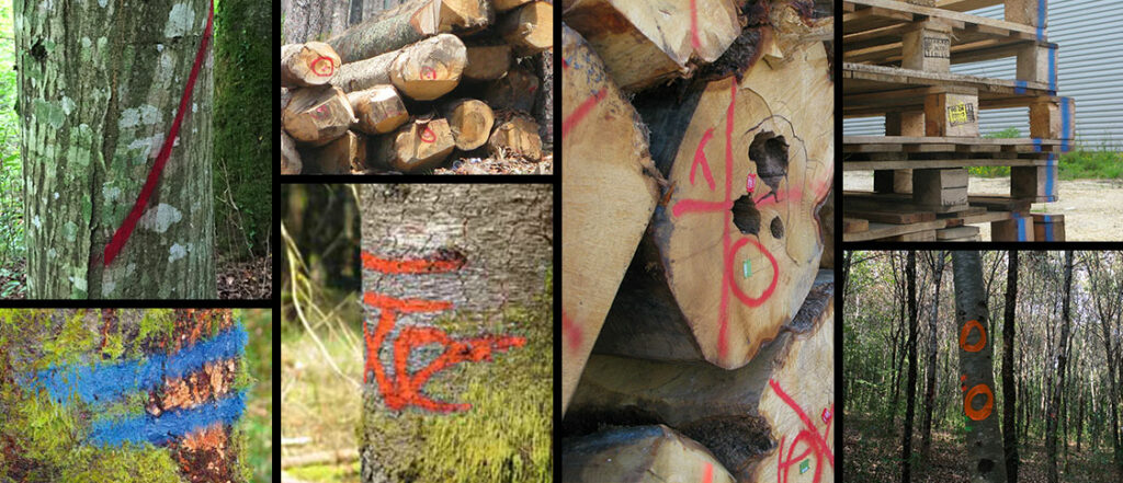 marquages d’arbres court et moyen terme pour abattage, marquages de bois d’éclaircies, de limites de parcelles temporaires, de lots de bois lors de ventes, des inventaires des grumes, des inventaires des produits de sciage…